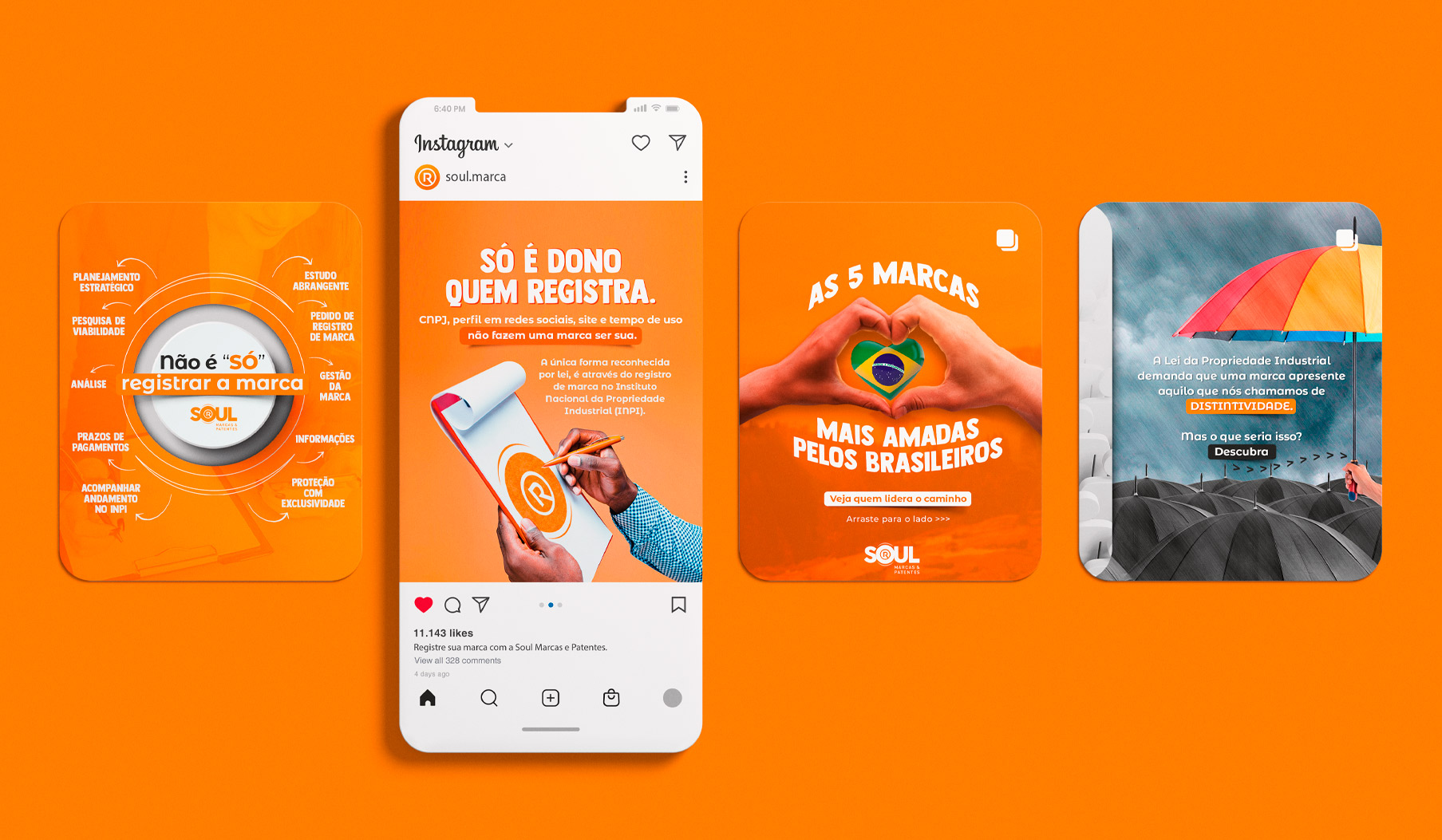 A Soul protege os seus ativos intangíveis através do Registro de Marcas e Patentes, enquanto ficamos resposáveis pela gestão da presença online da marca, que inclui redes sociais, materiais gráficos e campanhas.